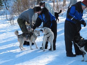 Am Dienstag lernen wir wie man sich hierzulande durch die Winterlandschaft bewegt. Wir besuchen eine Husky-Farm. Schon beim Aussteigen werden wir vom aufgeregten Gebell von etwa einhundert Tieren begrüßt, die es kaum erwarten können dass sie losrennen dürfen. Das Einspannen der Schlitten dauert aber eine Weile, bis dahin beschäftigen wir die Huskys mit viel Kraulen und Spielen. Das sind sehr neugierige und liebe Tiere, selbst ich der bekkantermaßen kein großer Hunde-Narr ist verstehe mich prima mit ihnen. Und dann gehts endlich los! Je fünf Hunde ziehen einen Schlitten, Annett liegt drin, macht Fotos und feuert die Huskys an, ich stehe dahinter, lenke, und – am wichtigsten – bremse. Die Huskys haben eine enorme Kraft und haben nur eine einzige Geschwindigkeit: schnell. Alles andere regelt man dann mit der Fußbremse, einem Metallbügel mit zwei Stäben die sich in den Schnee graben. So sausen wir etwa eine Stunde durch die sonnige Winterlandschaft, dann helfen wir noch beim Ausspannen und bedanken uns bei den Tieren noch mit ein paar Streicheleinheiten.